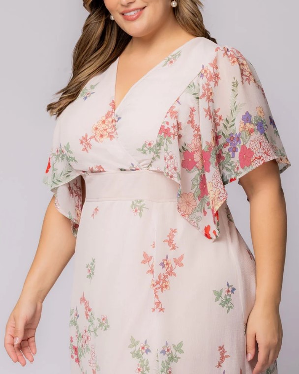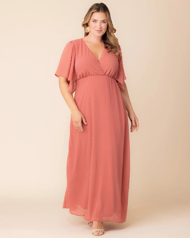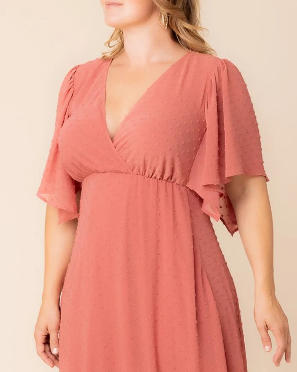 Prefer something long and flowy? Enter the Carmella Chiffon Wrap Gown. This peachy pink plus size maxi is made from airy Swiss dot chiffon and has romantic flutter sleeves, an elastic waist, and a flattering surplice neckline. Channel true Southern charm by styling it with a delicate floral hair accessory, dainty gold jewelry, and soft, strappy wedges perfect for grassy lawns and sunny strolls.
