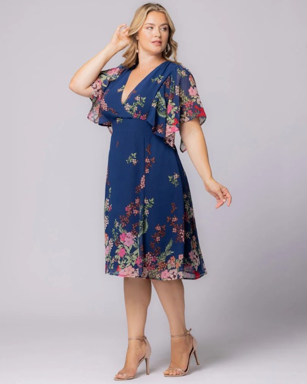 Looking for something flirty and fun? Try the Lillian Embroidered Cocktail Dress. Available in pastel pink or black floral embroidery, this plus size tea-length number features a mesh bodice, surplice neckline, flutter sleeves, and flouncy godet detailing that makes it perfect for twirling. Make it your own with a vintage-inspired clutch, a pop of pastel lipstick, and a sleek hat with a bit of texture to balance the feminine detailing.