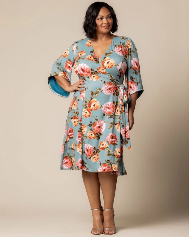 For something with effortless elegance and a twist of drama, the Gemini Wrap Dress checks all the boxes. Made from a soft brushed jersey, it features mid-length bell sleeves with contrasting lining and a flattering wrap silhouette. This plus size midi dress comes in two eye-catching colorways: a sweet pink floral and a pastel teal with delicate cherry blossoms. Pair it with a textured straw fascinator and bold statement earrings, then finish with comfortable block heels to enjoy the day from start to finish.
